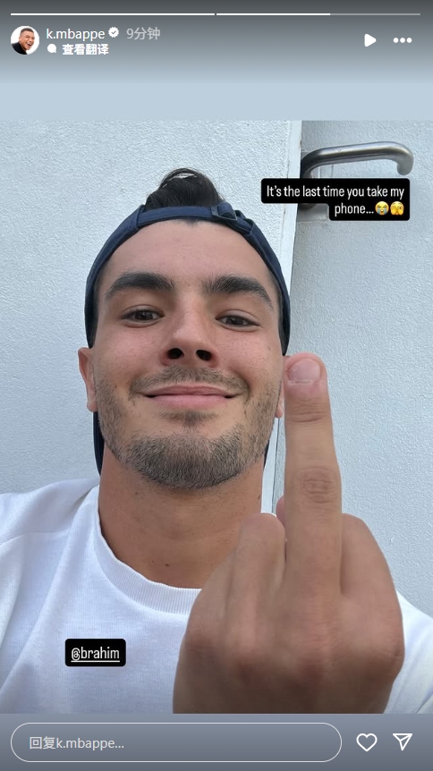 姆巴佩发现迪亚斯偷偷拿自己手机拍了一张竖中指的照片:“这是你最后一次拿我手机了...”